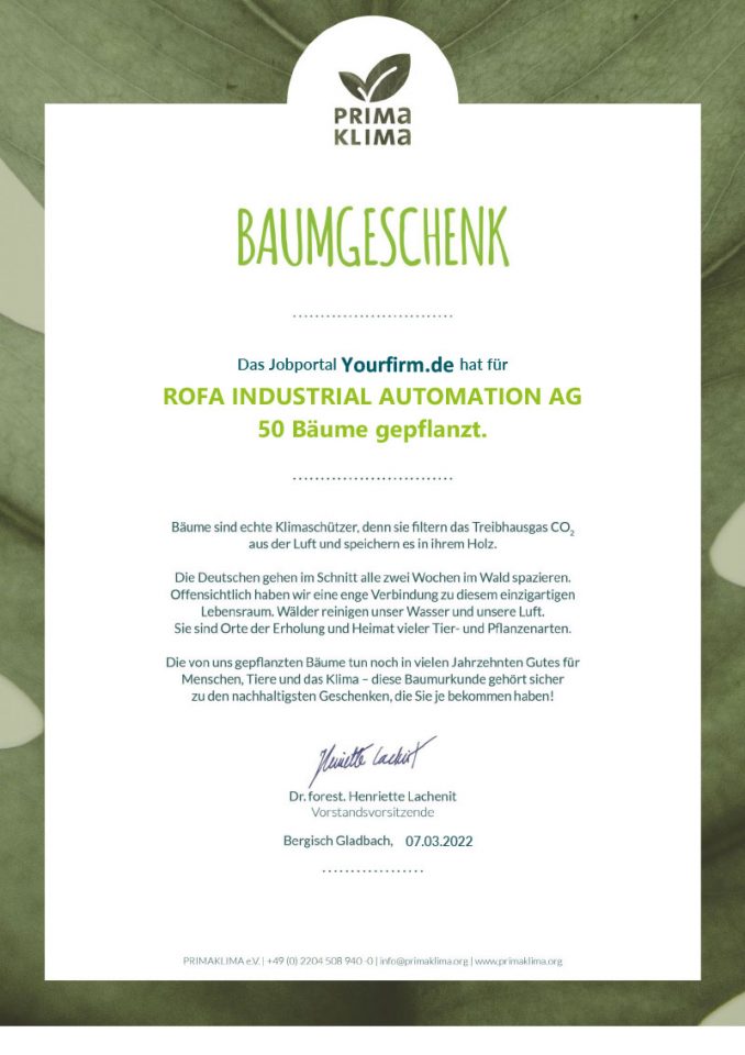 Auf diese Art und Weise sorgte die ROFA INDUSTRIAL AUTOMATION AG im vergangenen Jahr für 50 neugepflanzte Bäume und somit für einen grüneren Planeten.